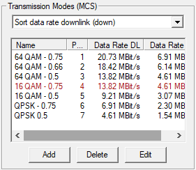 To view a list with the currently defined MCS, click and click the Air Interface tab. Further transmission modes can be defined, existing ones can be adapted during the planning process. The defined transmission modes can be sorted considering various criteria. The order of the MCS does not influence the simulations but the sequential arrangement in the tree view and on the dialogs.