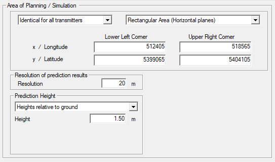 The simulation can be configured by specifying the area of planning, the resolution of prediction results, prediction height and whether additional prediction planes are defined in the database.