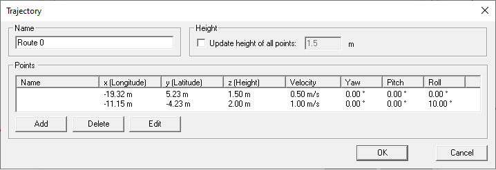 Specify a prediction trajectory / receiver trajectory. A trajectory can be added, deleted or edited. A trajectory can be imported from a .txt or a .csv file, and exported to a .txt file. When importing from a .csv file, a dialog will enable you to specify columns. For each trajectory, specify the name, x (Longitude), y (Latitude), z (Height), Velocity, Yaw1, Pitch2 and Roll3.