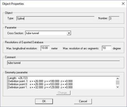 - The comment strings of splines, lines and portal nodes can not be changed. They always show the name of the assigned cross section or the name of the tunnel portal, respectively.