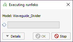 The Feko Solver is launched and the Executing runfeko dialog is displayed. The dialog gives step-by-step feedback as the simulation progresses.