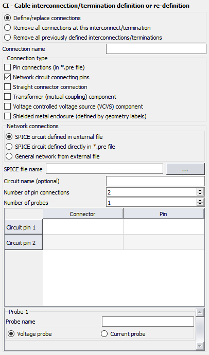 - The file name of the SPICE circuit to be connected between two pins. The file name is required when the SPICE circuit is loaded from an external file, but should not be used when entering the SPICE circuit directly in the .pre file. When the SPICE circuit is included directly in the .pre file, a field will be displayed where the circuit can be entered.