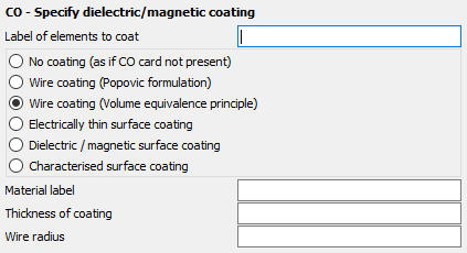 Figure 1. The CO - Specify dielectric/magnetic coating dialog, set to Wire coating (Volume equivalence principle).