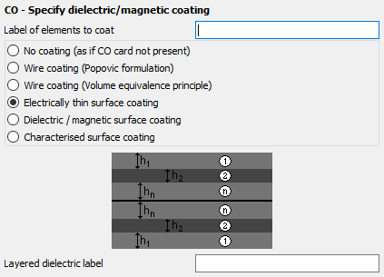 Figure 2. The CO - Specify dielectric/magnetic coating dialog, set to Electrically thin surface coating.