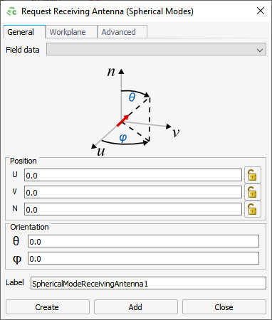 Figure 1. The Request Receiving Antenna (Spherical Modes) dialog. - In the Field data field, specify the field data to be used to define the spherical modes receiving antenna.