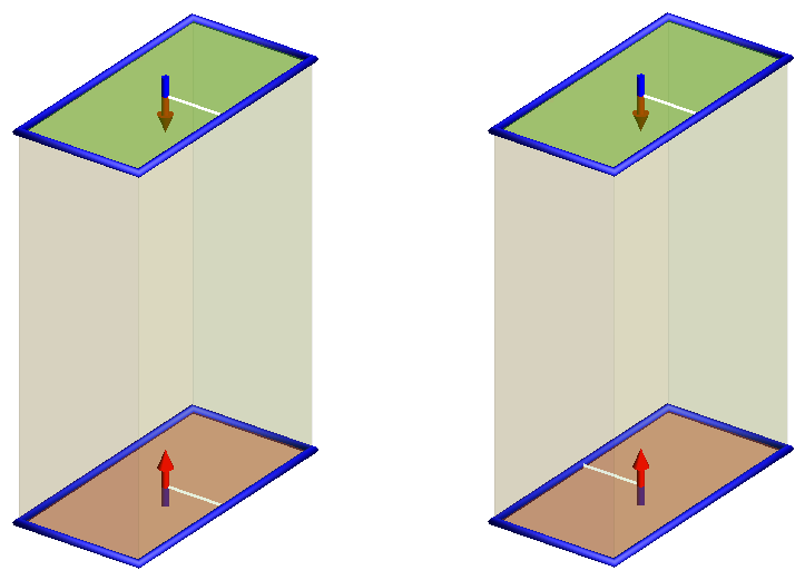 Figure 2. Two waveguide ports with equal reference directions (on the left) and two waveguide ports with opposite reference directions (to the right). For both these cases, the magnitude for S11 and S21 are identical. For the case where the reference directions differs, the phase for S21 differ by 180° from S11.