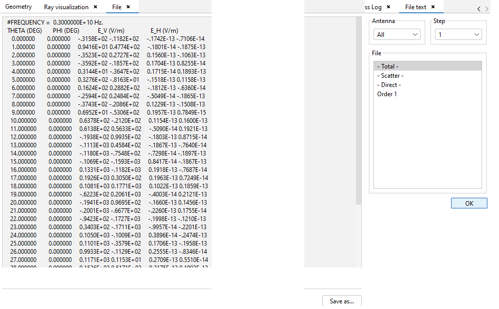 This option shows the simulation results as a text file. First, a panel will appear after selecting this option. Selecting this option will display a panel where the user should select an antenna, a component, the step and the order. To use this section, select a parametric step from the list, a component, one of the orders shown in the list and a step to get the results from and click on "OK" to load the data. A table will be presented with the values for the electrical field. To save the result click on the "Save as..."button below the table.