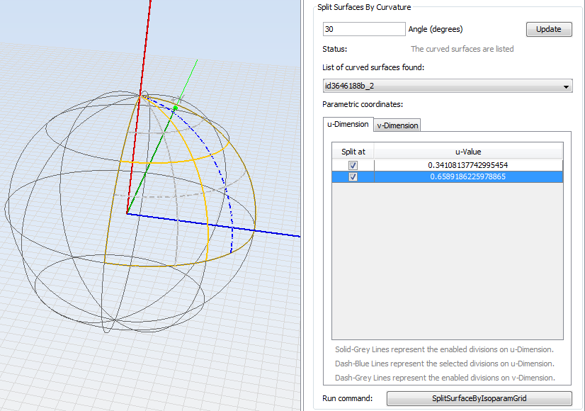 Click on SplitSurfaceByIsoparamGrid button to finish the example by dividing the surface with the enabled parametric coordinates. After run the command, the list of curved surfaces is updated and the first one is selected, as shown in next figure.