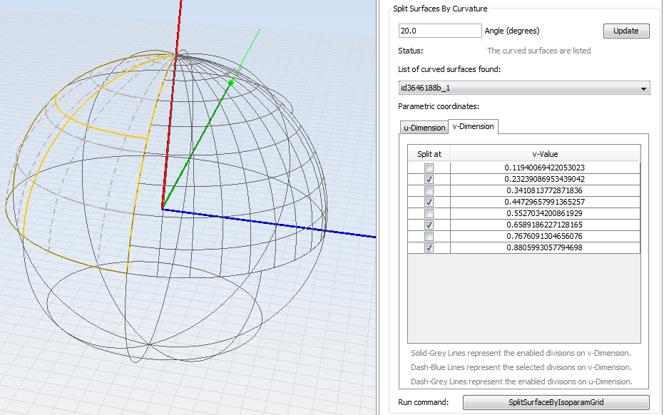 As all the surfaces of the sphere has the same shape and a curvature of 90 degrees in each parametric dimension, and the selected angle is not a divisor of 90, the curvature of 20 degrees may be different according to the start reference point that is considered. The next figure shows the representation of the second surface in the list with the default parametric coordinates on the table enabled and the disabled ones in V-dimension selected. In this figure is shown that the curvature analysis provides two different solutions the enabled and the disabled divisions.