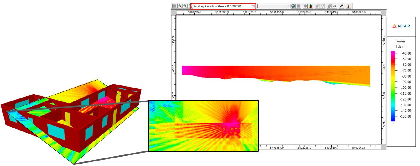 Figure 6. Examples of arbitrary prediction planes that are now available in the prediction plane drop-down list. Left: Arbitrary plane in an indoor scenario in the 3D view and new 2D view; Right: A vertical prediction plane used in the PE model. - The pixel center and pixel grid can be enabled on the Default