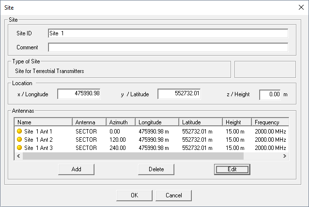 On the Site dialog, click on Site 1 Antenna