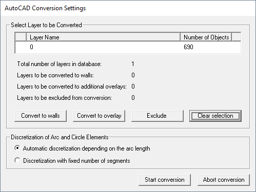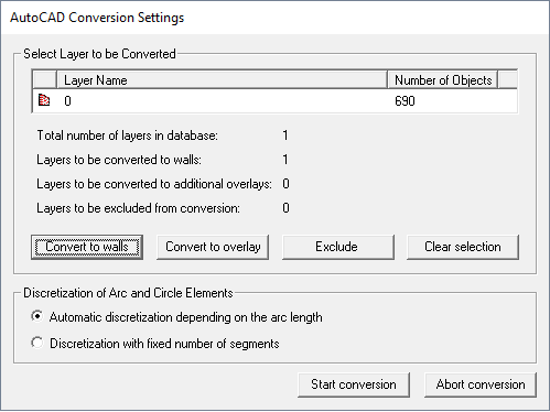 Figure 3. The AutoCAD Conversion Settings dialog with layer 0 converted to walls. -