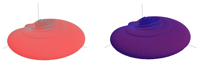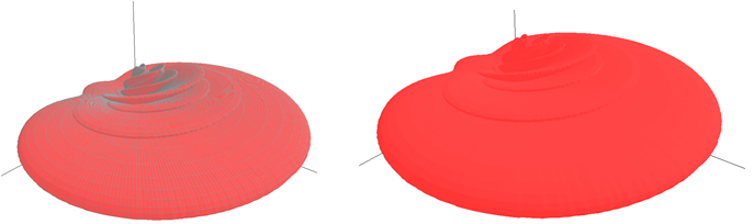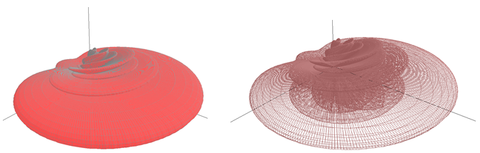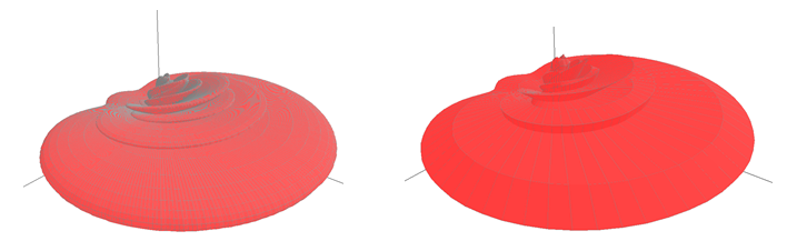 Figure 4. Same colors – but wire frame enabled (left) and disabled (right). - To draw the antenna pattern with filled surfaces instead of a wire frame, check