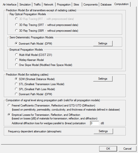 - Different models can be selected depending on the type of transmitter. Special models, which are used for the prediction of leaky feeder cables only, can be selected at the bottom of the dialog depicted above. The settings of the models can be changed by using the Settings button.