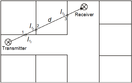 The multi-wall model gives the path loss as the free space loss including losses introduced by the walls and floors in the direct path between transmitter and receiver (see Figure 1). It has been observed that the total floor loss is a function of the number of penetrated floors. This characteristic is taken into account by introducing an additional empirical correction factor.