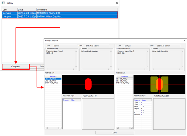 • Show History: Review the last updates and compare the changes. Upon selecting component and clicking Show History, history display dialog will open. Select target histories and click Compare to see the metal mask shape’s updated contents.
