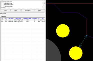 • Clearance between Pallet Area and Solder Mask: Check the separation distance between the soldering pallet area and the solder mask. The inspection result detects a case that is smaller than the value entered. Pallet to Solder Mask is displayed in the result window. The result window of SMD, DIP, and figure is divided according to each type.