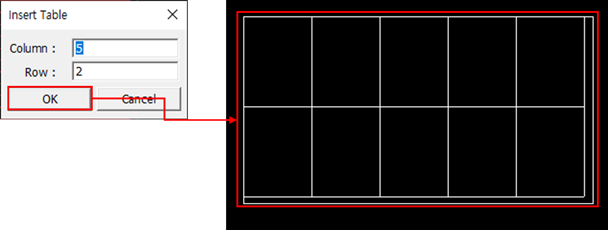 Selects the Table icon and sets the columns and rows of the table. Drag the page area to create a table area. A new table is created in the page list.
