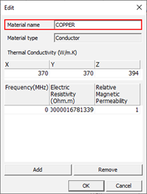 Modify material properties by double-clicking a material in the Material Manager dialog or by selecting a material and clicking Edit. Click Add Dielectric or Add Conductor to open the Edit dialog.