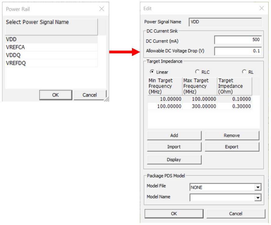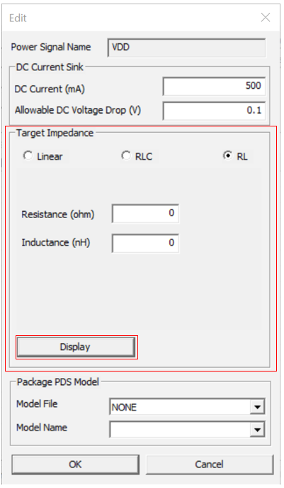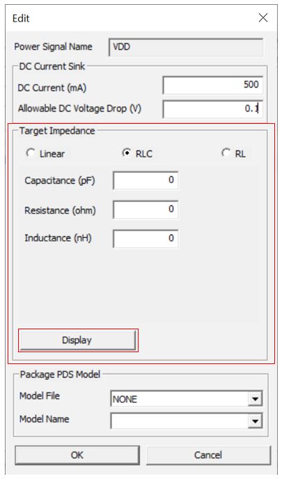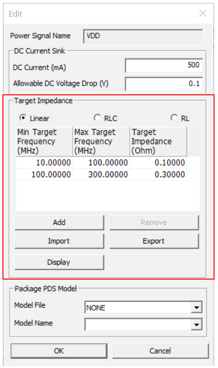 In Target Impedance, there are three types way to set up the target impedance: Linear, RLC and RL.