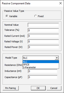 - Passive Component Data: Specify the passive part values in the form of RLC,
