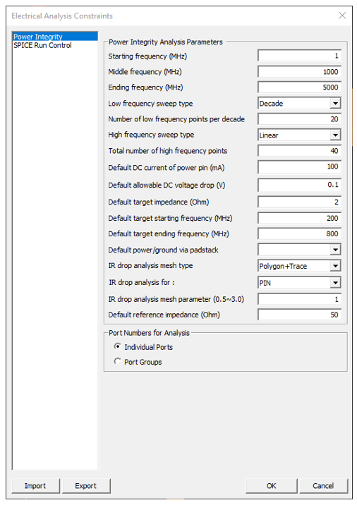 - Individual Ports: when selecting, the user directly designates and uses power pins for PDN analysis.
