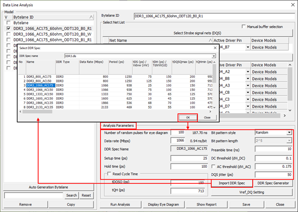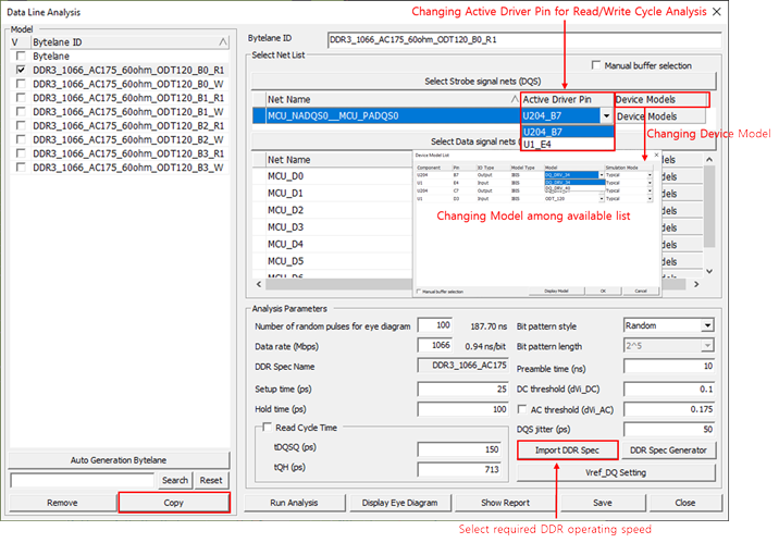 Creating a network analysis model starts with selecting data strobe net and data byte net from the net listing. The net name is initially assigned to the model name which can be changed by users. To analysis read and write cycle, CPU component must be selected for write cycle analysis and MEMORY component must be selected for read cycle analysis using Active Driver Pin.
