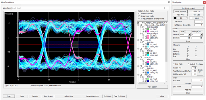 Analyze interconnect network of data byte group nets of DDR BUS in time domain to obtain the eye diagrams and transient waveforms which are different views of the signal delay and distortion.
