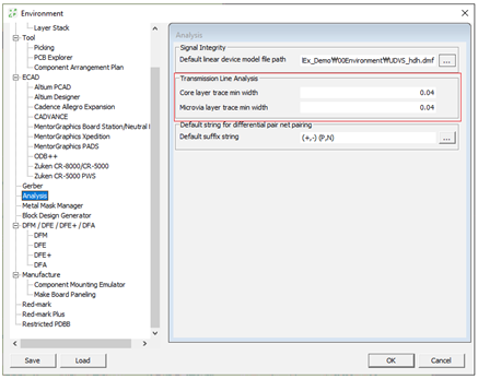 A built-in electromagnetic field solver is employed for the calculation of characteristic impedances and finding impedance matching trace widths. Finding impedance matching trace widths is performed under the constraints of minimum signal trace widths value defined in this setting item. If an impedance matching trace width cannot be found within the constraints, users need to change layer stack properties such as dielectric layer thickness and location of power or ground plane layer.