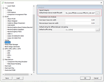 IO buffer device models of input and output pins of signal nets are stored in the part data file of individual components. When the device models are not available in the part data, the default device models defined here are used for transient simulation of signal integrity analyses. With the use of Linear Device Modeler, users can create linear output (driver) and input (receiver) device models and store them in a linear device model file. PollEx SI provides you with a system default linear device model file, UDVS.dmf.