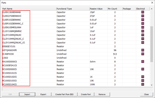 Icons display in the Parts dialog when the link operation is completed. The icon in the Electrical column denotes that thermal information is imported from unified parts.