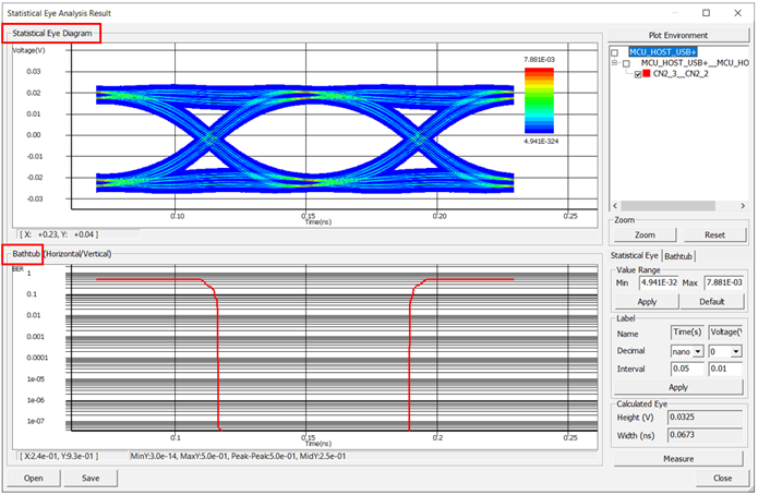 - Result tabs: The Statistical Eye Analysis Result dialogue is divided into two tabs, namely Statistical Eye and Bathtub Curve.