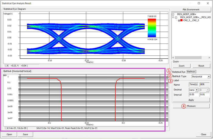 The following is an example of a Bathtub Curve obtained through the SerDes function of a specific differential line. The Bathtub Curve is located at the bottom of the Statistical Eye Analysis Result dialogue and is marked with a purple box below.