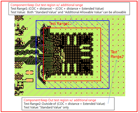 - Extended Region from COC: Enter the distance value to define additional range. The COC (Component Overlap Check) plus this distance value is considered the additional test range.