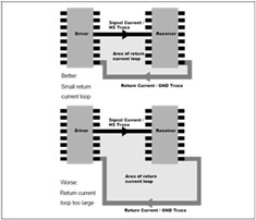 Keep the return current path as short as possible at the high-speed trace. In four or more layer boards avoid gaps or batteries of Vias within a ground plane in order to keep the loop of the current return path small. On two-layer boards provide power and ground nets close to the high-speed trace.