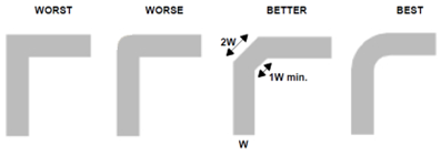 - Rounding the bend with a constant width reduces reflection and rise-time. Simpler to chamfering the corner to 45 degrees.