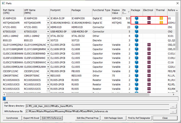 The Parts dialog shows the status of the properties assignment to the parts which are included in the current PCB system to analyze. The unified parts created by PollEx UPE can have versatile information such as electrical buffer model, package thermal parameters and 3D package geometry which needed for electrical, thermal and 2D/3D assembly analysis (by PollEx DFA and PCB assembly viewer) and it would be stored in specific folders in local or server system.