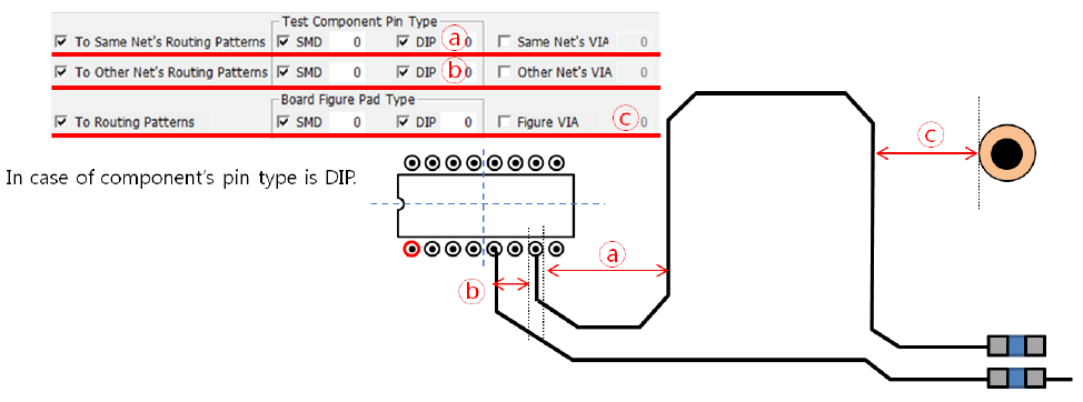 • To Other Net’s Routing Patterns: Set the clearance value between specifying type of the component pin pad and other net routing patterns.