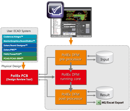 PollEx DFM is an optional module of PollEx PCB. Use PollEx DFM to check possible manufacturing design faults in early design stages. PollEx DFM is composed of three parts, running core and pre/post processor module. The pre-processor of PollEx DFM is used to make or input files and conduct post-processing for result review, respectively. PollEx DFM running-core is a manufacturing checking engine. Checked results will be served with an intuitive graphic link to layout design and can be exported into MS/Excel sheet.
