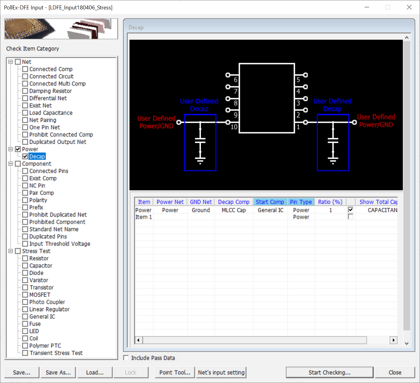• Show Total Capacitance: Upon selecting this option, DFE shows the sum of the capacitance value of capacitors connected to each power net.