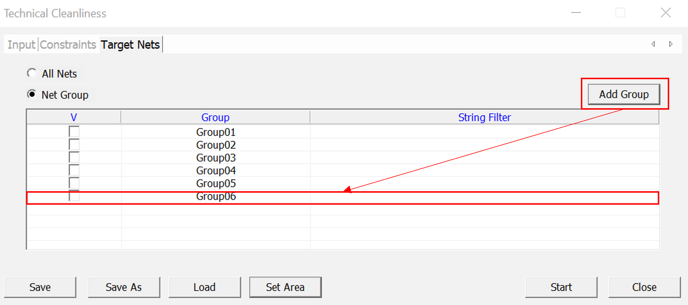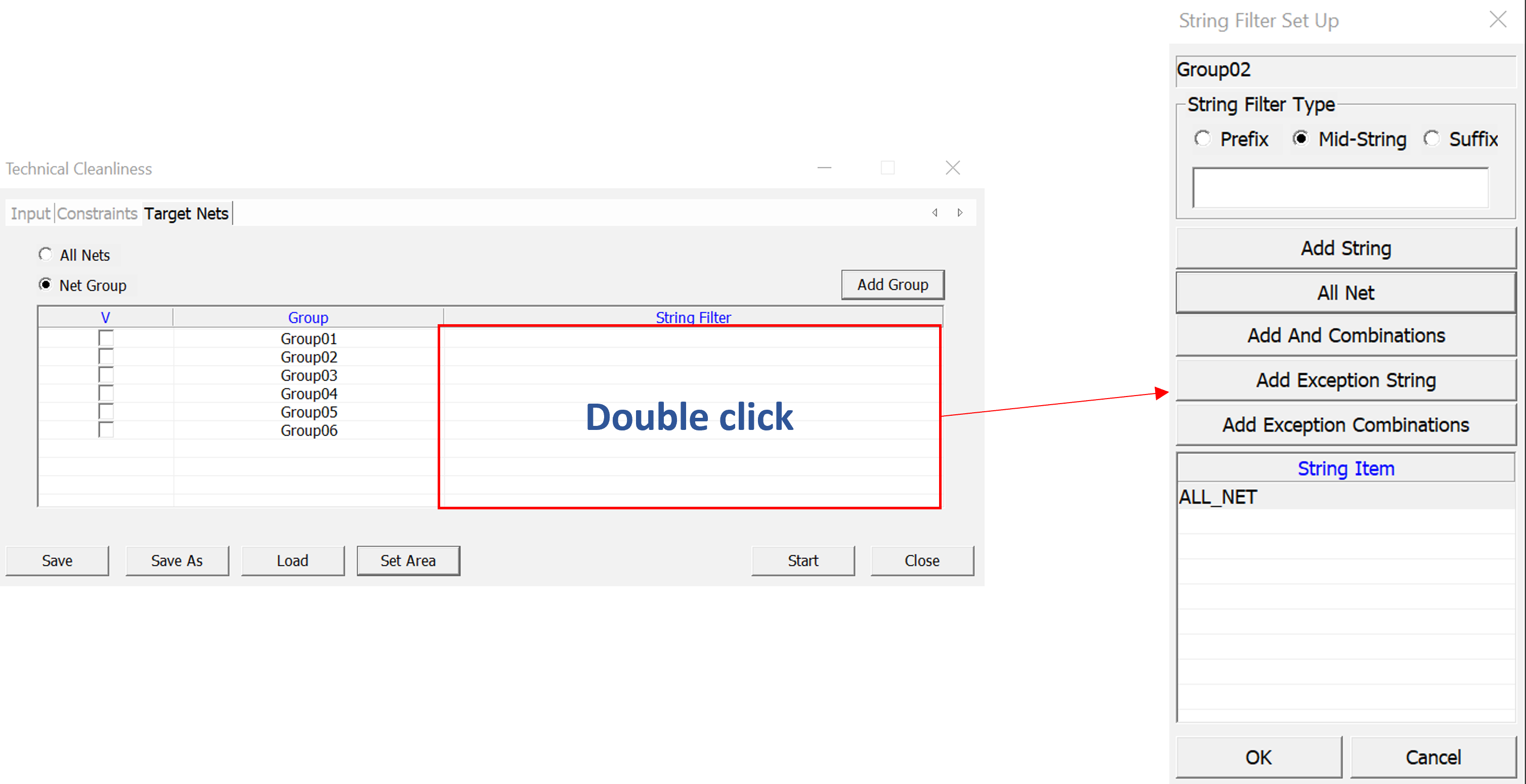 - Add Exception String - Excludes the nets with the defined conditions of the string filter and string filter type.