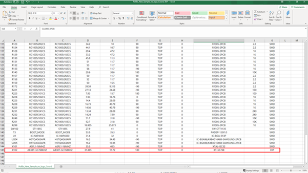 In the extracted Excel file, you can see the mounting coordinate list. Two files are extracted for the top and bottom side. You can see X102, which part name is AB38T-32.768KHZ, is specified as DIP.