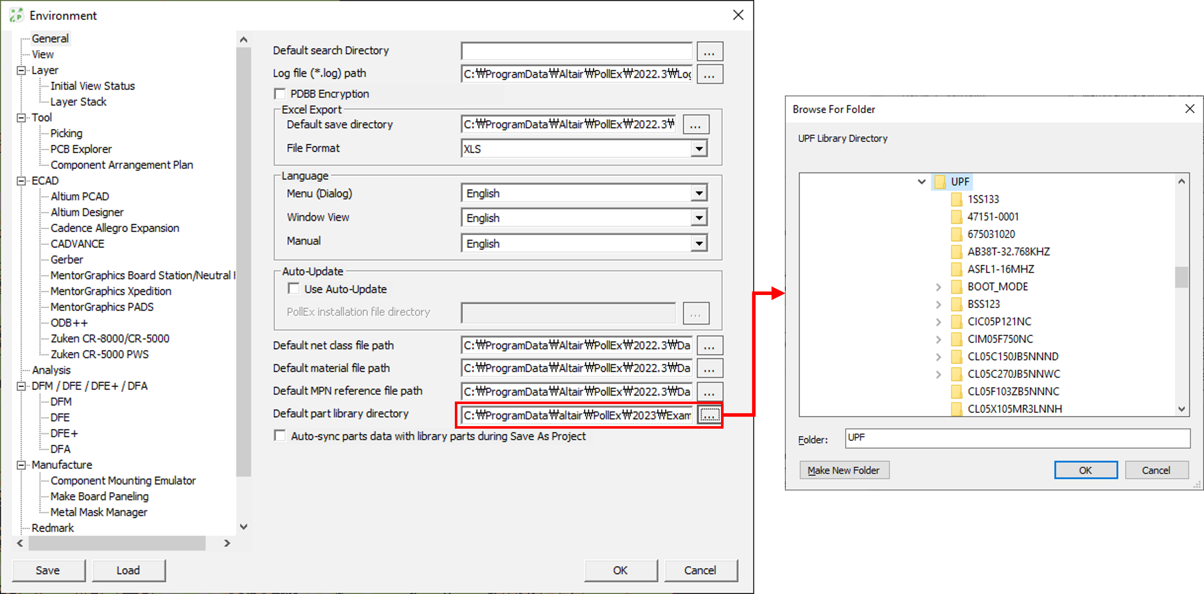 - From the Environment dialog, click the ellipses at the end of the Default part library directory field to define the default 3D part librarian path.