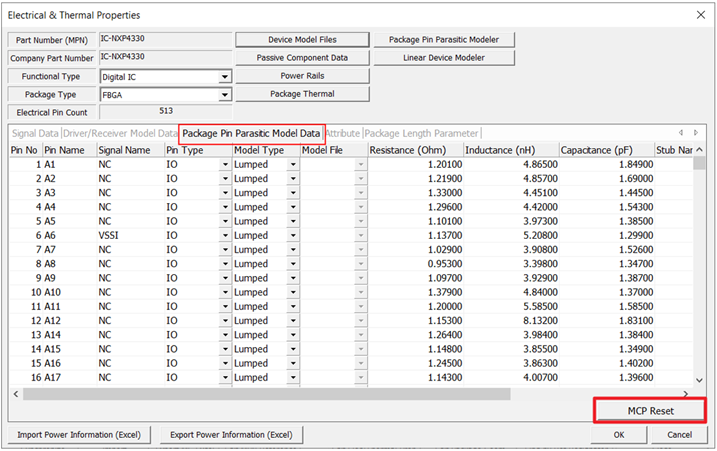 15. Click Package Pin Parasitic Model Data tab. Click MCP Reset to verify the detailed information for each pin.