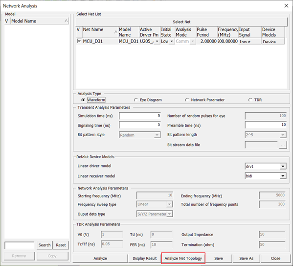 Check the connected components and pins to the selected net using the Device Model List dialog.