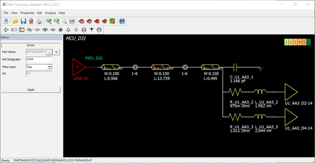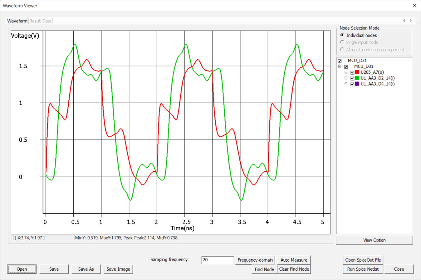 When the waveform analysis starts, electromagnetic simulation extracts the SPICE model for the selected net. The excitation source signal is applied to the net which is specified by the assigned pin model’s operating characteristics and the values defined at Input Signal and Pulse Period. When the simulation is done, the Waveform Viewer opens or exploring the waveforms.