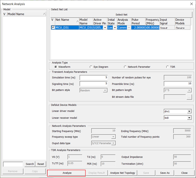 4. From the menu bar, click Analysis > Network Analysis for the waveform analysis setup.