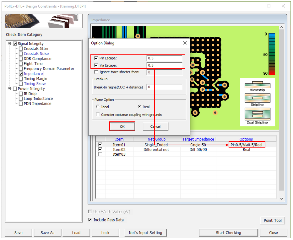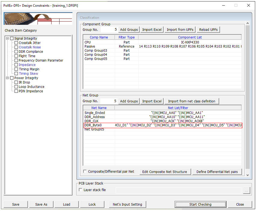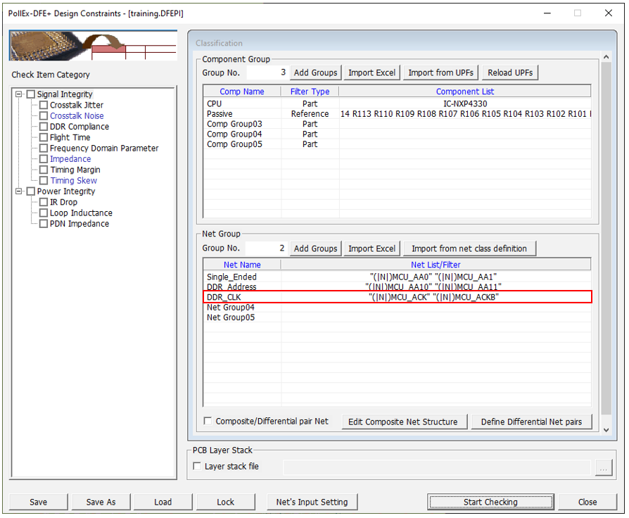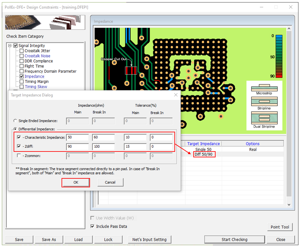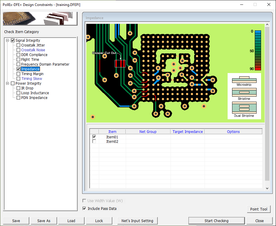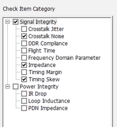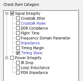 - Disable the Impedance and Timing Skew checkboxes in the Check Item Category section.