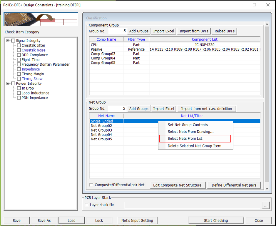 - Disable the Impedance checkbox in the Check Item Category section.