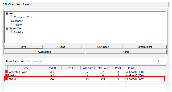 In the right window, you can see the error location and a picture. Review the list on the left and see the Working Voltage of R100 is 3.3V, but allowed Working Voltage is 2.0V, so it fails.